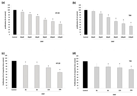 We examined the effect of DMF on cell proliferation and investigated its cytotoxicity using two colorectal adenocarcinoma cell lines, HT-29 and T84, revealing that it inhibited colorectal carcinoma (CRC) proliferation in a concentration- and time-dependent manner, as determined by BrdU assay (Figure 2a–d)