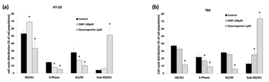 DMF induces G0/G1 arrest in HT-29 and increases the sub-G0/G1 phase in T84. Analysis of cell cycle distribution by FACS using propidium iodide-stained colon carcinoma cell lines (a) HT-29 treated with 100 µM DMF for 24 h; (b) T84 were treated with 100 µM DMF for 24 h. Positive control: Staurosporine 1 µM; Negative control: DMSO 0.2%. Data displayed are the mean values of at least three independent experiments and results are shown as mean ± SD. * p < 0.05: significant.