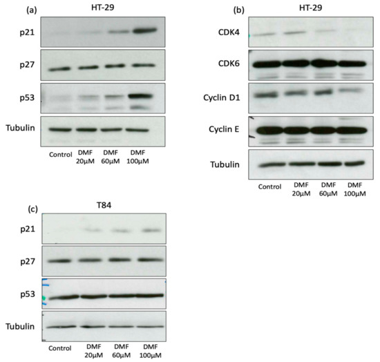 Expression of the cell cycle regulators p27, cyclin E and CDK6 did not change after DMF treatment in HT-29. In T84, an increase in p21 expression under DMF could be demonstrated, whereas p27 and p53 were not influenced by DMF (Figure 4c).