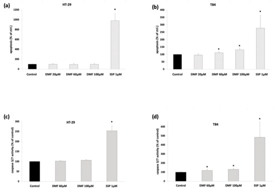 DMF induces apoptosis and caspase-3/7 activation in T84 but not HT-29 cells. Analysis of apoptosis using the Cell Death Detection Kit. (a) HT-29 cells were treated for 24 h with DMF at the indicated concentrations; (b) T84 cells were treated for 24 h with DMF at the indicated concentrations. Analysis of caspase-3/7 activity; (c) HT-29 cells were treated for 24 h with DMF at the indicated concentrations; and (d) T84 cells were treated for 24 h with DMF at the indicated concentrations. Mean values from at least three independent experiments are shown as mean ± SD. * p < 0.05: significant. As a positive control, staurosporine (SSP) 1 µM was used. DMSO 0.2% served as a solvent control.