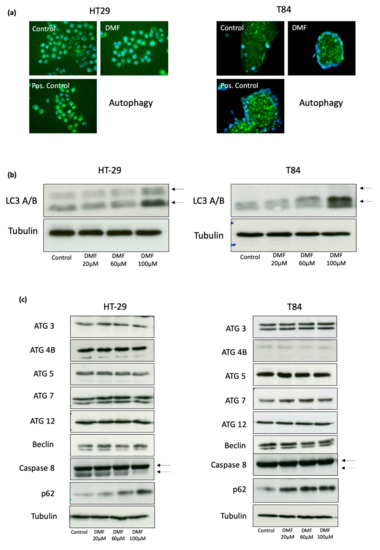 To reveal further potential mechanisms of proliferation inhibition induced by DMF, we next explored autophagic and senescent activities. Visualization of the autophagic vacuoles was performed by immunofluorescence. We found that DMF increased autophagic activity in both HT-29 and T84 cells (Figure 6a).