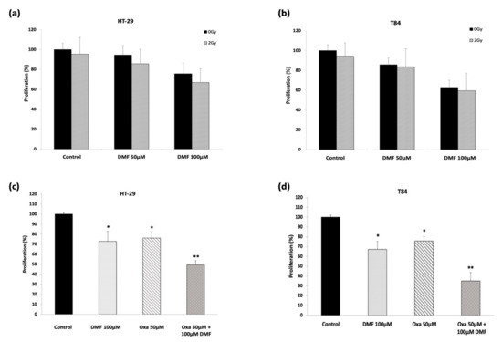 Combinational treatment with DMF and radiation or oxaliplatin. Proliferation assay for the DMF/radiation treatment (a) HT-29 and (b) T84 cell lines. DMF pretreated cells (3 h) were exposed to 0 Gy vs. 2 Gy and incubated for additional 21 h for an overall treatment timed of 24 h. Proliferation assay for DMF/oxaliplatin treatment in (c) HT-29 and (d) T84 cell lines. Oxaliplatin was added 2 h after pre-incubation with DMF or solvent, respectively, at indicated concentrations for another 22 h. Mean values from at least three independent experiments are shown as mean ± SD. p < 0.05: significant. * significant compared to untreated control. ** significant compared to single treatments and untreated control.