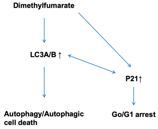 Autophagy in cancer and cancer treatment has been a controversial issue regarding its positive or negative role for tumor growth and seems dependent on the tumor entity as well as the compound inducing autophagy [7]. Additionally, Begleiter et al. revealed that a DMF diet prevents colon cancer in mice and rats by inducing phase II detoxifying enzymes [8]. Furthermore, it could be demonstrated that MMF is a metabolite of DMF enhanced CD56+ natural killer cell lysis of tumor cells by degranulation and upregulation of NKp46 and CD107a [9]. In addition, our group could demonstrate that DMF effectively inhibits angiogenesis and lymphangiogenesis in part by downregulation of a vascular endothelial growth factor receptor (VEGFR)-2 [10,11]. All of these results illustrate that DMF seems to have potential antitumorigenic effects. The underlying mechanisms of regulation are up to now not completely clear. Various authors demonstrated that DMF suppresses the activation as well as the nuclear translocation of Nuclear factor kappa B (NfkB) and therefore characterize p65 as a central target of DMF [12,13,14]. In addition, p21 and the cell cycle seem to be important targets of DMF [4,10,15].