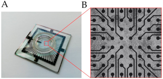 (A) Glass multi-/micro-electrode array (MEA) chip used to detect field potential (FP) of cells. (B) Cells seeded on an MEA surface, grown on top of the electrodes (black dots), Video S1.