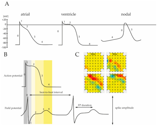 (A) Subtype specific pattern of the cardiac action potential. Ventricular, atrial and nodal cells are characterized by unique depolarization and repolarization processes leading to different action potential (AP) waveforms. Numbers correspond to the different phases that reflect the activity of involved ion channels. (B) Comparison of the different phases between recorded action potential and field potential. As field potential measurements allow reconstruction of the corresponding action potential it provides important physiological parameters of electrically active cells, including spike amplitude, FP interval, etc. (C) Moreover, MEA analysis can be applied to obtain data about prolongation velocity and direction of the field potential spreading throughout the cell layer.