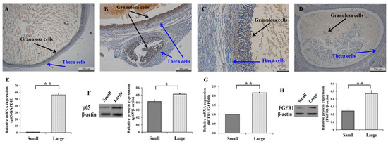 To explore the biological functions of p65 and FGFR1 during the development of follicles, the expression patterns of p65 and FGFR1 in small (1–3 mm) and large (5–7 mm) follicles were first detected (Figure 1). In large (Figure 1A) and small (Figure 1B) follicles, the immunohistochemical results indicated that p65 was likely to be exclusively expressed in GCs, as opposed to theca cells. Similar observations were made for FGFR1 in the large (Figure 1C) and small (Figure 1D) follicles. Moreover, the mRNA (Figure 1E) and protein (Figure 1F) levels of p65 were significantly higher in large follicles than in small follicles (p < 0.05), as were those of FGFR1 (Figure 1G,H). These results indicated that p65 and FGFR1 might promote the development of follicles by affecting the function of GCs.