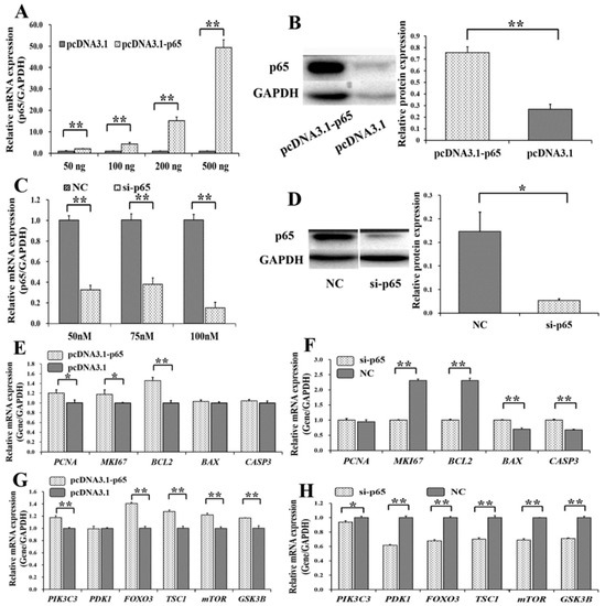 Among the genes from the apoptosis signaling pathway, pcDNA3.1-p65 was observed to significantly increase the mRNA levels of PCNA (p < 0.05), MKI67 (p < 0.05), and BCL2 (p < 0.01) (Figure 2E), and si-p65 significantly suppressed the mRNA levels of MKI67 (p < 0.01) and BCL2 (p < 0.01) but upregulated the mRNA levels of BAX (p < 0.01) and CASP3 (p < 0.01) (Figure 2F). Among the genes of the PI3K signaling pathway, pcDNA3.1-p65 significantly increased the mRNA levels of PIK3C3 (p < 0.01), FOXO3 (p < 0.01), TSC1 (p < 0.01), mTOR (p < 0.01), and GSK3B (p < 0.01) (Figure 2G). However, si-p65 significantly decreased the mRNA levels of PIK3C3 (p < 0.05), PDK1 (p < 0.01), FOXO3 (p < 0.01), TSC1 (p < 0.01), mTOR (p < 0.01), and GSK3B (p < 0.01) (Figure 2H).