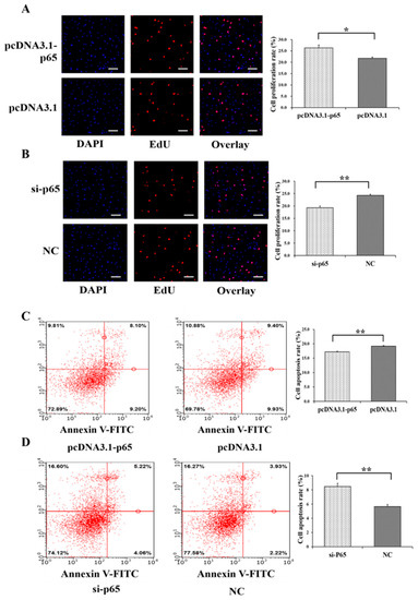 Moreover, pcDNA3.1-65 was found to significantly increase the cell proliferation rate of GCs (p < 0.05) (Figure 3A), and si-65 significantly decreased the cell proliferation rate of GCs (p < 0.01) (Figure 3B). In addition, pcDNA3.1-p65 was observed to significantly depress the cell apoptosis rate of GCs (p < 0.01) (Figure 3C), and si-p65 significantly promoted cell apoptosis in GCs (p < 0.01) (Figure 3D).