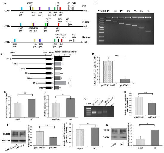 Several putative binding sites of p65 on the promoter of FGFR1 in pigs, mice and humans were predicted (Figure 4A). The potential binding sites of p65 were −1673/−1663, −1283/−1273, −1056/−1046, −746/−736, −534/−524, and −348/−338 on the promoter of FGFR1 in pigs (Figure 4A). To further explore the molecular mechanism for p65 regulating the expression of FGFR1, 5′ deletion and gene reporter assay were constructed for FGFR1 in pigs. The 5′ deletion fragments of P1 (−2044/+401), P2 (−1652/+401), P3 (−1069/+401), P4 (−815/+401), P5 (−700/+401), P6 (−377/+401), and P7 (−84/+401) were amplified and cloned into the eukaryotic expression vector pGL3-Basic (Figure 4B). Compared to P1, the relative luciferase activities of P2, P3, P4, and P5 did not show significant changes (Figure 4C) with deletion of −1673/−1663, −1283/−1273, −1056/−1046, and −746/−736, respectively. After deletion of −534/−524 (P5), the relative luciferase activity of P6 was significantly increased. However, after deletion of −348/−338 (P6), the relative luciferase activity was significantly decreased (P7). The −348/−338 region of FGFR1 is surrounded by the GC and TATA box. Moreover, the expression patterns of p65 and FGFR1 were positively correlated in small and large follicles (Figure 1E–H), indicating that P6 might harbor the exact binding site of p65.