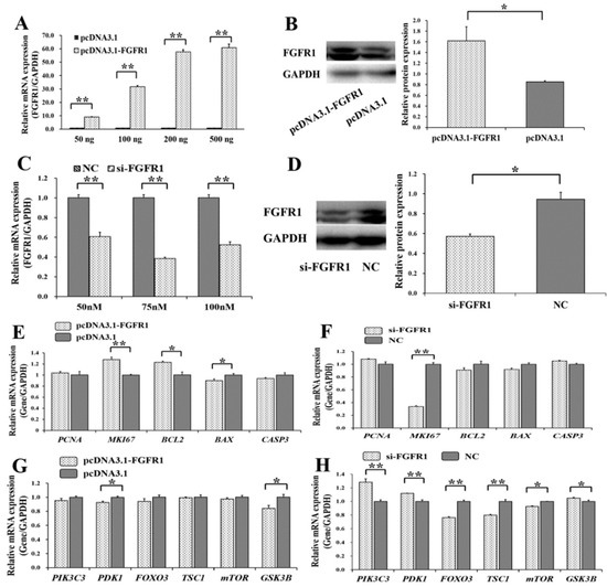 Biological effects of FGFR1 on apoptosis and PI3K signaling pathway. (A) The mRNA level of FGFR1 under different concentrations of pcDNA3.1-FGFR1 plasmid; (B) the FGFR1 protein count was stimulated by 200 ng of pcDNA3.1-FGFR1 plasmid; (C) the mRNA level of FGFR1 with different concentrations of siRNAs; (D) the FGFR1 protein count was suppressed by 70 nM of si-FGFR1. The relative mRNA expressions of genes from apoptosis signaling pathway after treatment by pcDNA3.1-FGFR1 (E) and si-FGFR1 (F); The relative mRNA expressions of genes from PI3K signaling pathway after treatment by pcDNA3.1-FGFR1 (G) and si-FGFR1 (H). * indicates p < 0.05; ** indicates p < 0.01. Data are represented as means ± SD. NC: negative control. Si-FGFR1: specific siRNA for FGFR1. PcDNA3.1-FGFR1: pcDNA3.1 overexpression plasmid of FGFR1.