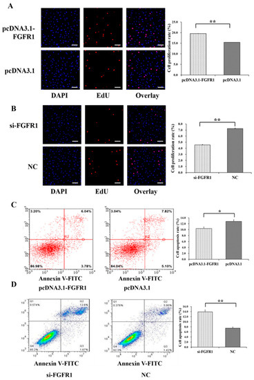Biological effects of FGFR1 on cell proliferation and apoptosis of GCs. The cell proliferation rate of GCs after treatment by pcDNA3.1-FGFR1 (A) and si-FGFR1 (B). The cell apoptosis rate of GCs after treatment by pcDNA3.1-FGFR1 (C) and si-FGFR1 (D). * indicates p < 0.05; ** indicates p < 0.01. Data are represented as means ± SD. The scale bar represents 100 μm. NC: negative control; PcDNA3.1-FGFR1: pcDNA3.1 overexpression plasmid of FGFR1; Si-FGFR1: specific siRNA for FGFR1.