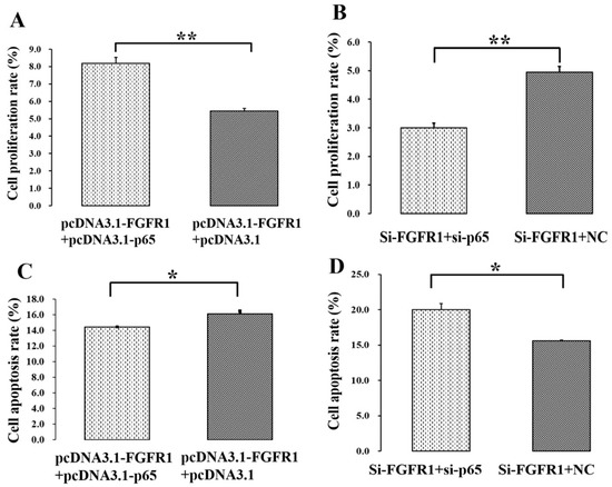 Additionally, the mRNA levels of apoptotic activators such as BAX and CASP3 were significantly upregulated by interfering with the expression of p65 (Figure 2F), and the mRNA levels of BAX and CASP3 were upregulated by interfering with expression of FGFR1 (Figure 5F), although the change in the expression of CASP3 was not statistically significant (Figure 5F). It is well known that BAX functions as an apoptotic activator and apoptosis marker. The induced expression of BAX is likely to trigger cell apoptosis in GCs of mice [38,39]. Higher expressions of CASP3, one of the pro-apoptotic genes, induce the apoptosis of GCs in bovines [36]. Downregulation of the pro-apoptotic CASP3 gene inhibits the apoptosis of GCs in pigs [40]. The mRNA level of CASP3 in GCs is negatively associated with the number of preovulatory follicles in humans, indicating that the accumulation of CASP3 impairs the development of follicles [41]. Furthermore, the cell proliferation rate was significantly promoted by p65 (Figure 3A,B) or FGFR1 (Figure 6A,B), and the cell apoptosis rate was significantly suppressed by p65 (Figure 3C,D) or FGFR1 (Figure 6C,D). These observations suggested that both p65 and FGFR1 might promote cell proliferation and inhibit cell apoptosis in porcine GCs.