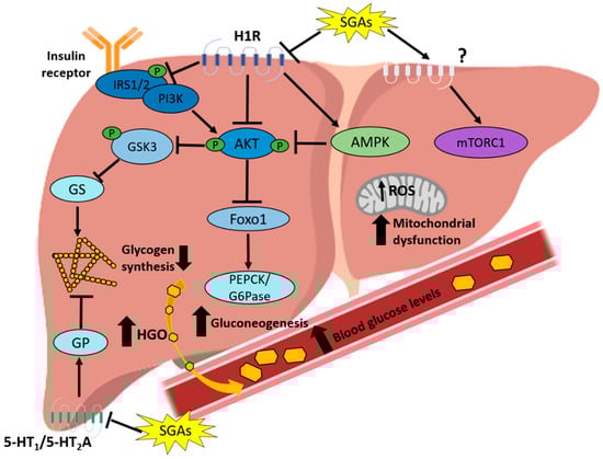 SGA-induced impairment in hepatic insulin signaling and glucose metabolism. SGAs impact the insulin signaling pathway at two levels: inhibition of IRS-1/2 phosphorylation and inhibition of AKT and GSK3 phosphorylation, with H1R antagonism being the proposed SGA target in insulin signaling impairment. Antagonism of 5-HT1 and 5-HT2A and inhibition of glycogen phosphorylase (GP) would decrease glycogen synthesis, an effect also enhanced by inhibition of glycogen synthase (GS). Both inhibition of glycogen synthesis and stimulation of gluconeogenesis by SGAs increase the hepatic glucose output (HGO), leading to an increase in blood glucose levels. SGAs have been also shown to activate both hepatic catabolic (AMPK) and anabolic (mTORC1) pathways and also induce ROS production and mitochondrial dysfunction.