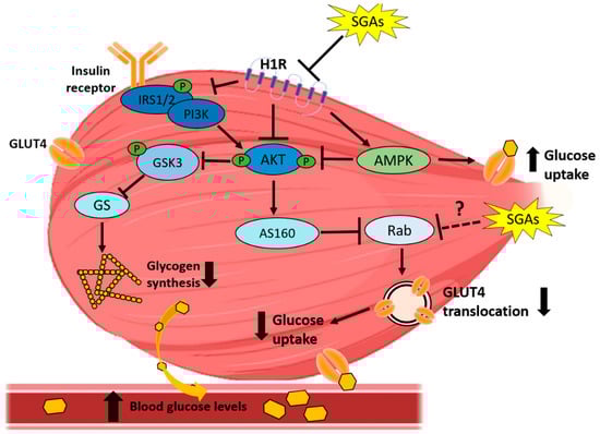 SGA-induced impairment in skeletal muscle insulin signaling and glucose uptake. SGAs impact the insulin signaling pathway at two levels: inhibition of IRS-1/2 phosphorylation and inhibition of AKT and GSK3 phosphorylation, with H1R antagonism being the proposed SGAs target in insulin signaling impairment. SGAs could also increase glucose uptake via AMPK activation, although these drugs most likely exert inhibition of this effect. GLUT4 translocation has been proposed a plausible target for SGAs-reduced glucose uptake in muscle.