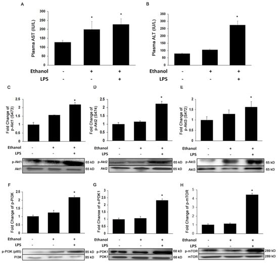 To determine whether ethanol and LPS effectively induce significant liver injury, we measured the injury markers, AST and ALT. As shown in Figure 1A, ethanol alone or with LPS significantly increased plasma AST levels by 1.6-fold and 1.8-fold (p ≤ 0.05), respectively. Similarly, plasma ALT levels were also markedly increased by 1.2-fold by ethanol alone, and to an even higher extent with added LPS (3.4-fold, p ≤ 0.05) (Figure 1B). To further investigate if ethanol and LPS-induced liver injury results in Akt activation, we evaluated protein phosphorylation of the three Akt isoforms and the phosphorylation status of the kinases that activate Akt. Ethanol alone or in combination with LPS significantly increased the expression of all three Akt isoforms by ~2-fold (Figure 1C,E) accompanied by corresponding increases in the phosphorylation of PI3K, PDK1, and mTOR by 2-, 2.5-, and 4-fold (p ≤ 0.05), respectively (Figure 1F,H).