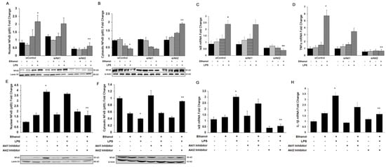 3.2. Akt2, But Not Akt1, Is Involved in Ethanol and LPS-Induced Nuclear Translocation of NFκB-p65 and Induction of Pro-Inflammatory Cytokines In Vitro and In Vivo