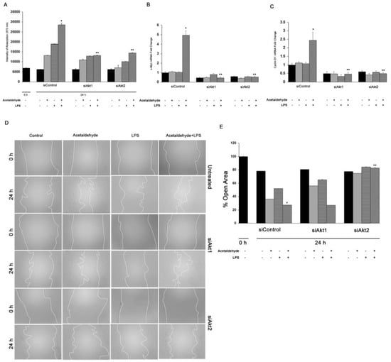 As shown in Figure 5D,E, acetaldehyde and LPS also induced HSC migration resulting in wound closure after 24 h by 63% and 48% respectively, compared to control with closure of only 22%. Acetaldehyde and LPS treatment led to a further increase in migration with 73% of the wound closed at 24 h. Silencing of Akt1 did not alter HSC migration when compared to cells treated with the scrambled siRNA. In contrast, there was a significant decrease in HSC migration in cells silenced for Akt2, to only 17% of that observed in cells treated with both acetaldehyde and LPS. Together, these results reflect the functional specificity between of Akt1 and Akt2 in mediating HSC proliferation and migration.