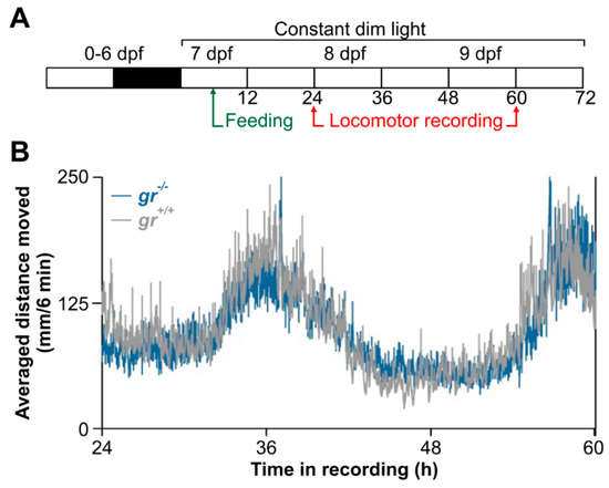 Circadian activity rhythms of gr+/+ and gr−/− larvae zebrafish. (A) Larvae were reared under light–dark (LD) cycle from 0 to 6 dpf and then maintained for 3 days in constant dim light (LL). Locomotor activity were recording from 24 to 60 h in LL. (B) Mean waveform of locomotor activity under LL for 36 h (n = 144/genotype).