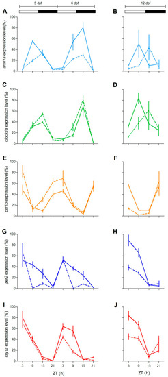 Daily expression levels of clock genes in zebrafish larvae. Quantitative polymerase chain reaction (qPCR) analysis of clock and light-regulated clock gene expression at 5–6 dpf (A,C,E,G,I) and 12 dpf (B,D,F,H,J) in zebrafish larvae exposed to LD cycles. For all panels, each point represents the mean ± SEM (n = 4). On the y-axes are plotted relative expression levels (100% is the maximum level detected for each gene in all dpf), while on the x-axes time is expressed as zeitgeber time (ZT, where ZT0 represents lights on). White and black bars represent light and dark periods, respectively. gr+/+ = solid line; gr−/− = dotted line.