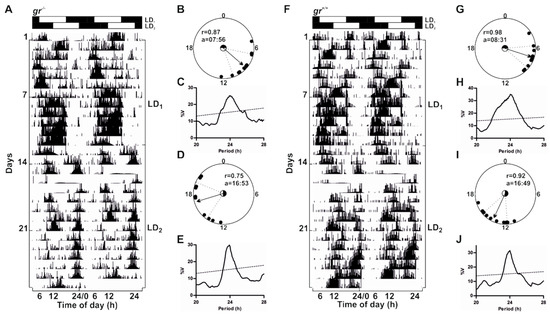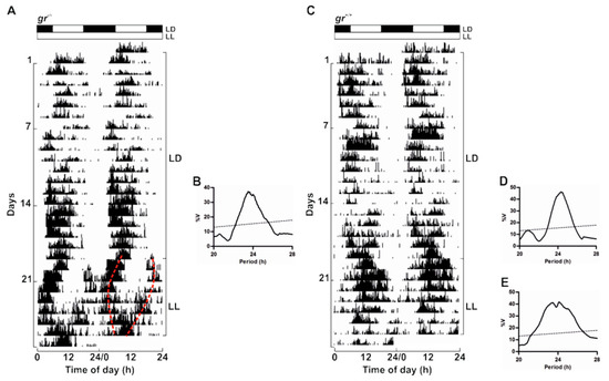 To confirm the presence of a circadian timekeeping system also in adults, we recorded locomotor activity in gr mutant and WT kept in LL after 20 days of entrainment in a 12:12 LD cycle (Figure 6). In LL both genotypes displayed a rhythm of locomotor activity demonstrating the circadian nature of the rhythmicity (Figure 6). As previously reported [37], the locomotor activity in constant lighting conditions exhibited different patterns as a splitting of activity in different periodicity within the circadian range (20–30 h; representative example in Figure 6A) or a unimodal activity with a period close to 24 h (representative example in Figure 6C). Periodogram analysis showed the entrainment to both LD cycles and the significant rhythmicity in LL (Figure 6B,D,E).