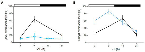 Furthermore, in the liver we tested the daily expression of srebp1 and pck2, two genes involved in the lipidic and glucidic metabolism, respectively. srebp1, of which the timing of cyclic accumulation in the nucleus is under the control of nr1d1, is a key transcription factor that regulates genes in the de novo lipogenesis and glycolysis pathways [38,39], pck2 codifies for an enzyme essential in gluconeogenesis, a process that is directly regulated by glucocorticoids [40]. Interestingly, while pck2 is rhythmically expressed only in the gr+/+ (gr+/+: p < 0.0001, gr−/−: p > 0.7; Figure 9A), srebp1 changed its expression during the day in both genotypes (p < 0.0001; Figure 9B), but peaked at different CTs (gr+/+: ZT15, gr−/−: ZT9).