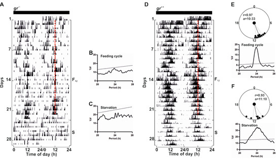Behavioural entrainment by periodic food availability of gr+/+ and gr−/− adult zebrafish. Representative actograms (A,D), χ2 periodogram analysis and circular diagrams (B–C,E–F) of adult zebrafish gr+/+ and gr−/− maintained under constant darkness and fed once a day at a fixed time (12:00). Starting and ending day of each feeding cycle (F12) and starvation (S) is shown on the right of the actogram. The number of days is indicated on the left and the time of day is plotted on the bottom of each actogram. Red dotted lines indicate the time of feeding. Circular diagrams showing acrophases for F12 and S period are plotted (E–F). Activity records of each F12 or S cycle were subjected to χ2 periodogram analysis (B–C,E–F). For more details see Figure 5.