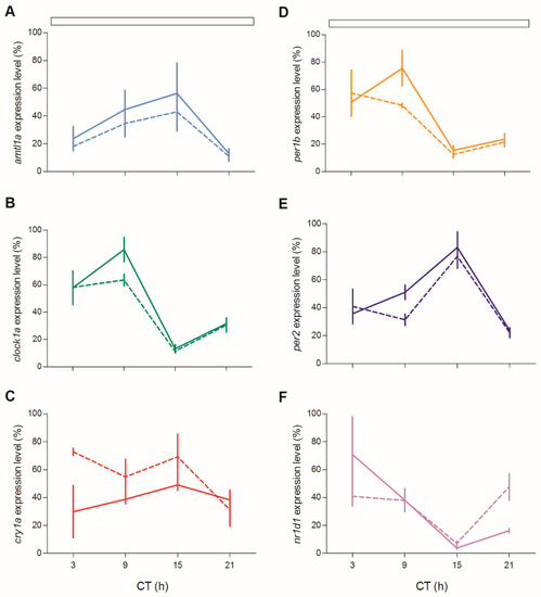 - Whitmore, D.; Foulkes, N.S.; Strahle, U.; Sassone-Corsi, P. Zebrafish Clock rhythmic expression reveals independent peripheral circadian oscillators. Nat. Neurosci. 1998, 1, 701–707. [Google Scholar] [CrossRef] [PubMed]