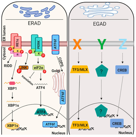 Organelle homeostasis imbalance signaling pathways. ER stress signaling (with the unfolded protein response (UPR) sensors IRE1, PERK and ATF6; left) and Golgi stress response (right). Left panel: unfolded protein accumulation is sense by three ER resident receptors: IRE1, PERK and ATF6. IRE1 activation imposes the induction of two different activities: kinasic and RNAsic activity. The first controls phosphorylation of the pro-apoptotic factor JNK, the latter mediates IRE1 dependent mRNA decay (RIDD) and the unconventional splicing of XBP1 mRNA. PERK activation induces eiF2a phosphorylation, thus inducing global mRNA translation inhibition and translation of specific mRNA, such as ATF4 mRNA. ATF6 activation induces its translocation into the Golgi, where it is the substrate of two proteases. This cleavage promotes the release of an active transcription factor known as ATF6f. All together these factors mediate the transcriptional program unfolded protein response. Right panel: unfolded protein accumulation also induces a Golgi-dependent response. The main receptors are still needed to be defined (X, Y and Z), but currently two main effectors were identified: TF3/MLX and CREB3. The first regulates genes necessary to increase Golgi function, the latter transcribe for ARF4, thus inducing apoptosis.