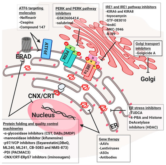 Disturbance of protein quality control systems, the ER/Golgi functions or protein secretion is considered as a strong cause of many human diseases associated with defects in the secretory pathways. Proteostasis-associated diseases differ from each other by different gene mutations, and the process and the machinery involved in their currency and progression. On the other hand, they all have one common feature, which is the accumulation of immature and/or mis/malfolded proteins (Figure 4). Here we highlighted diverse strategies that could be translated into the clinic to target the secretory pathway. Notably, since the strong connection between the different components, one strategy could be applied to contemporary hit diverse targets.