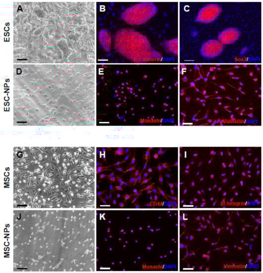 Neural precursors obtained from embryonic and mesenchymal stem cells. Morphology of ESCs at passage number 10 (A). Immunocytochemistry for E-cadherin (B) and SOX2 (C). NPs have elongated bipolar morphology, end feet, and oval nuclei (D). Immunocytochemistry for the NP markers musashi (E) and vimentin (F). Morphology of MSCs at passage number 7 (G). Immunocytochemistry for CD44 (H) and βI integrin (I). NPs showed similar morphology as we observed on ESC-NPs (J). MSC-NPs were positive for musashi (K) and vimentin (L). Nuclei were stained with DAPI (blue). Scale bar A, D, G, J: 25 μm; B, C, E, F, H, I, K, L: 50 μm.