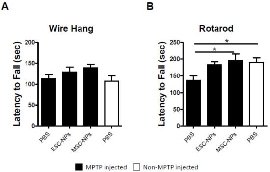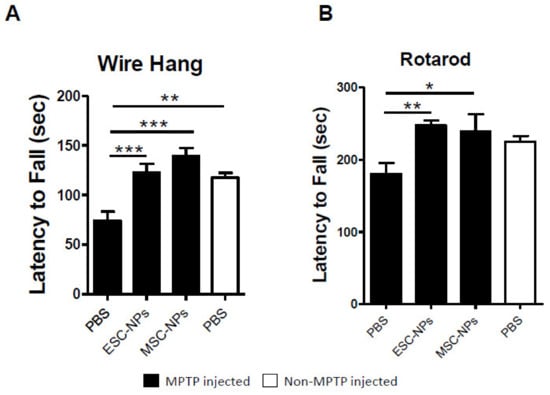 To test the efficacy of an i.v. injection of NPs to treat PD pathology, we used MPTP-treated mice. This is perhaps the most widely used model of PD, which is characterized by loss of dopaminergic neurons in the nigrostriatal pathway with accompanying Parkinsonism. C57BL/6J mice were treated intraperitoneally with MPTP hydrochloride (30 mg/kg) administered daily for 5 consecutive days to generate the PD-like phenotype. These MPTP mice demonstrated impairment in the motor specific tasks of wire hanging and rotarod as compared to non-MPTP injected mice by student t-test (p < 0.001 and p < 0.05, respectively) (Figure S1). Ten days after the last MPTP injection, mice were inoculated twice over a week with 1 × 106 cells of either ESC-NPs or MSC-NPs by tail vein injection. Animals injected with PBS were used as controls. Ten days after the last cell injection, mouse groups were behaviorally assessed by the wire hang and rotarod tests to determine the effect of the inoculation in clinical signs (Figure 2).