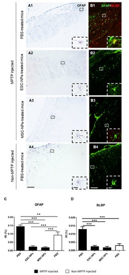 MPTP-injected mice show reduced astrogliosis after NP peripheral treatment. MPTP inoculated ESC-NPs and MSC-NPs and PBS-treated mice, along with non-MPTP PBS mice, were sacrificed 10 days after the infusion. Brains were collected and astrocytosis was evaluated by histology. Representative images for bright field GFAP immunostaining (A1–A4) and double immunofluorescence for GFAP and BLBP (B1–B4) in the striatum of MPTP-injected and non-MPTP-injected age-matched mice are presented. Insets show details of immunopositive astrocytes depicted in dashed squares. Image analysis quantification of the GFAP (C) and GFAP/BLBP-positive cells (D) in the whole brain (ANOVA, ** p < 0.01; ***p < 0.001). Scale bar: 100μm (A1–A4, B1–B4); 10μm (insets). N = 6 mice/group, 8 sections/mouse.