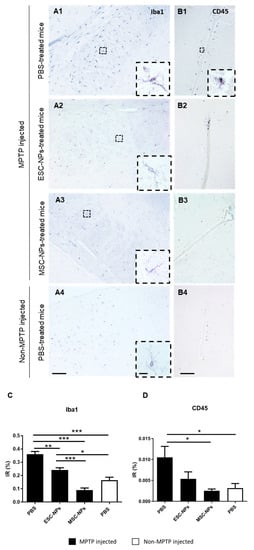A chronic inflammatory response is thought to contribute to the pathogenic processes underlying PD. For that reason, we next tested the effects of stem cells on neuroinflammation. To investigate the effects of NPs on astrogliosis and microgliosis in the MPTP-induced PD model, immunohistochemistry analysis and quantification was performed for inflammatory markers throughout the brain. The non-MPTP PBS injected group was also subjected to neuroinflammation analysis (Figure 4A). We found a significant difference among the groups in GFAP and BLBP-expressing astrocyte levels in the brain (one-way ANOVA, p < 0.0001). MPTP-injected mice inoculated with PBS displayed significant astrogliosis compared to the non-MPTP PBS control group (p < 0.01). Treatment with both ESC- and MSC-NPs significantly decreased GFAP expression in MPTP-injected mice when compared to the PBS control group and to the non-MPTP injected group (p < 0.001) (Figure 4C). Then, immunostaining of reactive astroglia was performed using the BLBP (brain lipid-binding protein) antibody. BLBP is a marker of radial glial and reactive astrocytes as well as adult neural stem cells [34]. We quantified cells that were positive for both GFAP (in green) and BLBP (in red) to determine the amount of reactive astrocytes. Histological analysis demonstrated that BLBP-expressing astroglial cells were reduced in MPTP-injected mice receiving the ESC-NP (p < 0.001) and MSC-NP (p < 0.001) inoculation relative to PBS-injected animals (Figure 4B). Furthermore, BLBP-positive astrocyte levels in NP-treated mice were similar to non-MPTP PBS control mice. There was a significant difference among the evaluated groups by one-way ANOVA (p < 0.0001) (Figure 4D). For the expression of Iba-1, a microglia marker. MPTP induced a significant increase in Iba-1 burden with respect to non-MPTP injected mice (Figure 5A1–4). The i.v. treatment using both ESC- and MSC-derived NPs significantly reduced the burden of Iba1-immunopositive microglia compared to the PBS injected mice (Figure 5C). Interestingly, the reduction in reactive microglia was more prominent in animals treated with NPs derived from MSCs when compared to ESCs (p < 0.001), while non-MPTP PBS animals had less Iba-1 IR compared to ESC-NPs mice (one-way ANOVA, p < 0.05). Monocytes can infiltrate the brain and differentiate into macrophages. To determine whether the reduction of Iba1 was due to a decrease in microglial cells (Iba1/CD45lo) or monocyte/macrophage (Iba1/CD45hi) infiltration, we immunostained brain sections using the CD45 antibody [35]. The CD45 signal was shown mostly in animals treated with MPTP without treatment of NPs (Figure 5B1–4). The representative pictures and immunoreactivity (IR) quantification data demonstrate that the levels of CD45 were significantly reduced in animals treated with MSC-NPs (Figure 5D), showing that there is a decrease in monocyte/macrophage infiltration. CD45-positive cells were found mainly around the third ventricle and a significant difference between the groups was found (one-way ANOVA, p = 0.014).