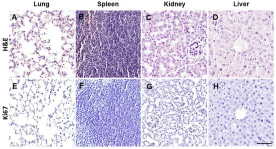 In order to test the safety of the i.v. inoculation with NPs, we carefully checked for the development of tumors from injected NPs by palpation and visual screening once every 2 weeks after the last inoculation. No tumor formation was observed during the execution of these experiments. In addition, hematoxylin-eosin general staining was performed in the brain, lung, spleen, kidney, and liver to determine the presence of tumor formation in animals sacrificed 10 days, 3 months, and 9 months after the treatment. No evidence for tumor cell masses was detected in any of the animals analyzed, as observed in the representative pictures in Figure 6A–D. We also analyzed the tissue samples using the proliferation antibody Ki67, and no tumor formation was found (Figure 6E–H).