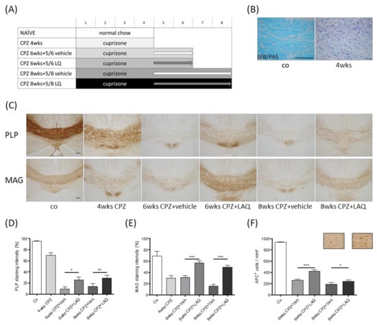 One of the models which allows such questions to be addressed is the cuprizone model. In this model, oral intoxication with copper-chelator cuprizone induces, oligodendrocyte apoptosis within days, which is closely followed by the activation of the innate immune cells of the brain, i.e., astrocytes and microglia, finally leading to the demyelination of distinct white and grey matter brain areas. Although OPCs are activated during the course of cuprizone intoxication [], remyelination fails due to an ongoing cuprizone-induced mature oligodendrocyte injury. In this study, we tested the hypothesis that laquinimod, which has been shown to ameliorate cuprizone-induced demyelination [,], supports remyelination in non-supportive environments. To this end, mice were intoxicated with cuprizone for up to 8 weeks and treated with laquinimod, starting at the beginning of week 5, when the endogenous remyelination pathways are activated in this model. We can show that daily laquinimod treatment induces myelin recovery, which is paralleled by an amelioration of axonal degeneration.