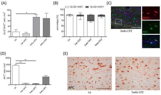 Oligodendrocyte pathology. (A) Quantity of OLIG2+ and Ki67+ single and double positive cells during the course of cuprizone-induced demyelination (Kruskal–Wallis test followed by Dunn’s multiple comparison test). (B) Percentage of single and double positive cells in relation to the entire OLIG2+ cell population. (C) Representative image of OLIG2+ and Ki67+ double positive cells. (D) Quantification of APC+ cell numbers (Kruskal-Wallis test followed by Dunn’s multiple comparison test). (E) Representative images of anti-APC stained sections in the medial corpus callosum. Scale bar: 100 μm. The following symbols were used to indicate the level of significance: * p < 0.05, ** p < 0.005.