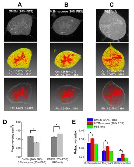 Confocal and electron microscopy revealed that nuclear chromatin is highly compact and reorganized in hypertonic media condition []. Therefore, we expected that the volume and RI (i.e., molecular density) of chromosomes in mitotic cells may change according to osmolarity. To investigate the influence of osmotic changes on the structure and physicochemical properties of mitotic chromosomes in live DM cells, the physiological state of cells was changed using culture media of varying osmotic pressure (Table 1 and Section 2) []. Live DM cells are normally cultured under relatively high osmotic pressure in DMEM supplemented with 20% FBS, and hypertonic conditions were achieved by adding 0.2 M sucrose. In contrast, relatively hypotonic conditions were achieved by substituting PBS for the media, although the osmotic pressure of PBS is lower compared with that of DMEM media. RI value of mitotic chromosomes, cytosol, and plasma membrane was measured by ODT (Figure 2A–C, Figure S2a–c).