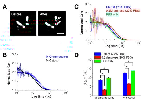 Tracking the mobility (i.e., the diffusion coefficient, D) of probe molecules is a well-known method for calculating the local viscosity of fluids and molecular crowding in cells and aqueous solutions [,,]. As previously demonstrated [], diffusional mobility of mGFP was quantified in the cytosol and chromosomes during mitosis in live DM cells under varying osmotic conditions (Figure 3). The volumes of mitotic chromosome were larger in DM cells compared with those of other cell lines (Figure 3A). Therefore, it was feasible to target and measure the FCS of mitotic chromosomes and the cytosol of single DM cells as previously demonstrated []. Consistent with previous findings [], the fluorescence autocorrelation curves of DM cells fit well to the single component model of free diffusion with or without a triplet term, revealing that the diffusional mobility of mGFP in mitotic chromosomes was much lower compared with that in mitotic cytosol (Figure 3B). Moreover, the sharp curves at the region of short lag times under 10 μs corresponds to the triplet term generated by the photochemical process.
