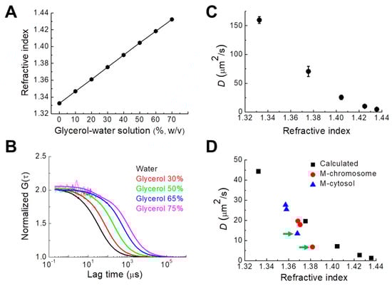 To quantify the relationship between the RI of the aqueous medium and the diffusion coefficient of fluorescent probes molecules in the medium (i.e., viscosity of the medium), we measured the RIs of water and glycerol–water solutions of different densities and evaluated the D values of rhodamine 6G in the solutions. There were linear relations between the RI and the molecular density of glycerol solution at 25 °C and 37 °C, respectively (Figure 4A, Figure S5). The result is in good agreement with the known properties of glycerol–water solution []. Previous studies found that the cellular viscosity of cultured cells is much higher compared with that of pure water [,,]. The viscosity of solutions with glycerol concentrations ranging from 20% to 50% (w/w) is similar to the fluidic viscosity of intracellular compartments. Since the viscosities of glycerol–water solutions are also well known [], D values of rhodamine 6G (0.479 kD) in glycerol–water solutions were experimentally determined from FCS measurements (Figure 4B, see also Methods). Comparison of measured RI and D values establishes the relationship between RI and D (Figure 4C). From the model experimental results and the Stokes–Einstein relationship, theoretical D values of mGFP (molecular mass 28 kDa) in glycerol–water solutions were calculated []. The mean D values (Figure 3D, Table 3) of mGFP measured in the mitotic cytosol (blue) and DM chromosomes (red) were plotted for comparison with the theoretical D values (Figure 4D). For DMEM and PBS media, the measured and theoretical D values of mGFP in mitotic DM cells were consistent. In contrast, the D value of DM cells cultured in hypertonic media was significantly smaller compared with the theoretical value. Hypertonic stress enforces molecular crowding in cellular components because of the osmotic extraction of water from the cells [], suggesting that molecular diffusion in the cytosol and chromosome under conditions of high osmolality is largely affected by molecular crowding induced by hypertonic conditions [,]. Otherwise, such water extraction can restrict nucleosome movement in the chromosome, which significantly slows the diffusion of probes []. Moreover, these large changes of RI and D values of mitotic chromosomes of DM cells are similar to those for the interphase cytosol and nucleoplasm, but different from that of the interphase nucleolus as previously demonstrated [].