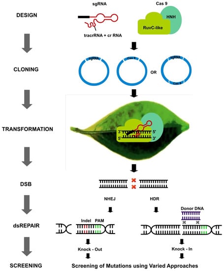 Recently developed CRISPR/Cas (clustered regularly interspaced short palindromic repeats/CRISPR-associated protein) technique based on type II prokaryotic adaptive immune system, that helps bacteria or archaea against the invading phages, provides an excellent alternative to the first generation site-directed nucleases [,]. TALENs and ZFNs were successfully used for gene editing, but CRISPR/Cas provides several advantages in terms of design, specificity, multiplexing, cost, and flexibility over other methods. Recent efforts have expanded the utility of CRIPR/Cas system by exploring various fundamental aspects of the biological mechanisms (Figure 1). CRISPRs were identified in bacterial DNA as early as 1987 [], but their function in bacteria was not understood until 2005 [,], and in 2007 CRISPRs were proved to provide immunity in combination with Cas protein []. In 2012, Doudna and associates were the first ones to perform gene editing using CRISPR/Cas in a cell-free system [], and shortly afterward five independent groups applied this system for editing genes in the animal system [,,,,]. First reports of gene editing in plants using CRISPR/Cas9 came in 2013 in the model plants Arabidopsis and Nicotiana benthamina [,] and rice []. Three types of CRISPR/Cas systems, utilizing different molecular mechanisms are found in bacteria. The CRISPR/Cas system used was derived from the prokaryotic type II CRISPR system of Streptococcus pyogenes, which includes precursor CRISPR RNA (pre-crRNA), trans-activating crRNA (tracrRNA) and Cas9 nuclease. The tracrRNA is involved in the maturation of pre-crRNAs into crRNAs []. Type II system utilizes a single protein for target recognition and cleavage. Dual tracrRNA:crRNAs are engineered as single guide RNAs (sgRNAs) while using CRISPR/Cas for genome editing. sgRNAs retain two critical features, 5′ sequence that is complementary to the target DNA and 3′ sequence that binds to the Cas9 protein. DSBs generated can be repaired by non-homologous end joining (NHEJ) and homology directed repair (HDR) to create gene knockout or gene knock-in type of modifications, respectively (Figure 2) []. NHEJ is the most dominating and active pathway in eukaryotes for repairing DSBs, leading to small insertions or deletions (indels), thus producing a gene knockout or silencing of a gene. HDR can be utilized in the presence of a repair template, and can result in insertion, translocation, or inversion of gene sequences. HDR can lead to knock-in, protein-domain swaps, new gene functions or alteration in gene regulation. HDR can induce more desirable mutations, but the preference of NHEJ over HDR in natural systems prevents its efficient and more frequent application in practical systems. Since its inception, CRISPR/Cas has progressed rapidly and has been applied successfully in a wide range of plants and on varied traits (Table 1). This review deals with such technological advancements, including various multi-targeting approaches, precision editing, epigenome editing, and various other aspects.
