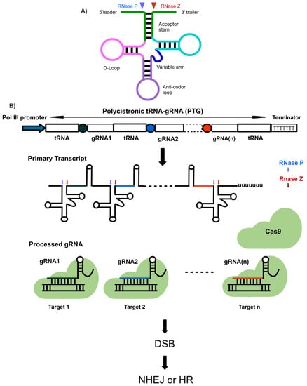 - Xie, K.; Minkenberg, B.; Yang, Y. Boosting CRISPR/Cas9 multiplex editing capability with the endogenous tRNA-processing system. Proc. Natl. Acad. Sci. USA 2015, 112, 3570–3575. [Google Scholar] [CrossRef]