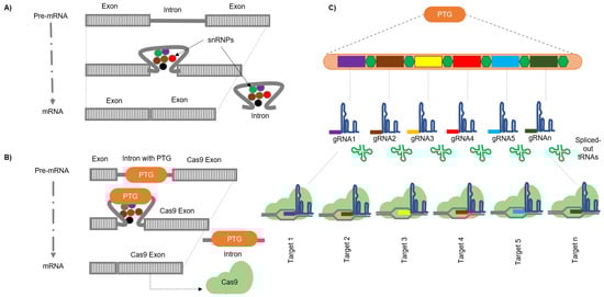 Schematic representation of multiplex genome editing by utilizing intron polycistronic transfer RNA-guide RNAs (inPTGs). Here, figure (A) depicts the regular small nuclear ribonucleoprotein (snRNP) mediated splicing mechanism. (B) Introns are engineered to code for fused polycistronic tRNA-gRNAs (PTGs). (C) PTGs are further processed to release individual gRNAs (shown here in different colors) via the tRNA processing machinery. Individual gRNAs can then go on to target their complementary loci in the genome.