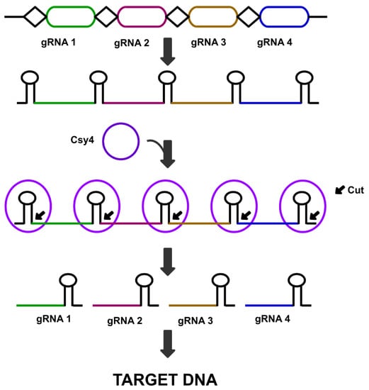 The Csy4 endoribonuclease, from Pseudomonas aeruginosa has been effectively exploited to excise multiple gRNAs from synthetic polycistronic transcript []. Multiple gene expression was observed by designing gRNAs in a tandem array, each flanked by recognition sequences for Csy4 (Figure 5). Also, the bacterial origin of Csy4 makes it a suitable tool for building complex synthetic circuits without interfering with the endogenous RNA machinery of the host cell [,]. The successful functioning of Csy4 endonuclease has been shown in several, plants. The Csy4 endoribonuclease from Pseudomonas aeruginosa has a high substrate specificity towards a 28 nucleotides RNA stem-loop (5′-GTTCACTGCCGTATAGGCAGCTAAGAAA-3′) []. Once bound to the RNA stem-loop, Csy4 cleaves after the guanine at position 20, allowing to generate multiple RNA transcripts. The RNA processing ability of Csy4 can be applied for gene deletion and interference lucratively. The PTG and cys4 mediated multiplexing has also been successfully validated in tomato (Solanum lycopersicum), tobacco (Nicotiana tabacum), barley (Hordeum vulgare), wheat (Triticum aestivum), and Medicago truncatula [].