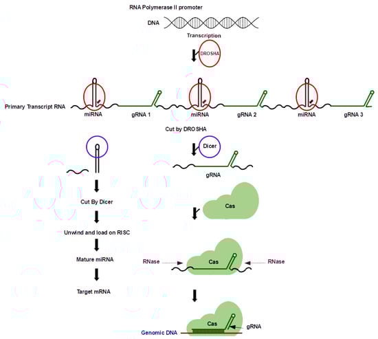 Drosha based multi-targeting genome editing approach is a multi-target genome editing approach in which tandem consecutively arranged miRNA (or shRNAs)-sgRNA genes are expressed under the control of a single polymerase II promoter. Generally, Pol III promoters are manipulated to express sgRNAs because of the lack of special structures such as 5′ cap, 3′ tail or introns, but they are inefficient because of short length and limited life of Pol III transcripts (Figure 6). Polymerase II transcribed sgRNAs are desired because of their ability to be expressed in a tissue-specific and flexible manner, but these have redundant nuclease activity because of the 5′ cap structure. This issue can be rectified by using miRNA-based strategy, using the microprocessor protein complex, comprised of Drosha, an RNase III enzyme, and its cofactor, DGCR8 or Pasha for the production of mature gRNAs and miRNAs []. Even though a highly robust approach, it is still relatively less preferred by the plant scientists.