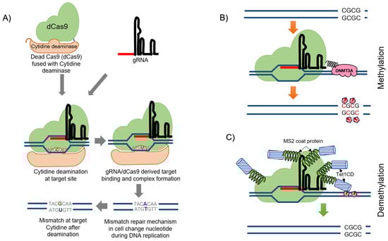 (A) Precision base editing by utilizing cytidine deaminase fused with dCas9. With the help of guide RNA (gRNA), Cas9 make complex at a specific target site and then the cytidine deaminase act on cysteine present on the opposite strand. The deamination process converts cysteine (C) to uracil (U) which later gets converted into adenine-thymine base-pair during DNA replication by the inbuilt mismatch repair mechanism. (B,C) CRISPR mediated methylome editing. Dead Cas (dCas) is fused to a DNA methyltransferase (DNMT3A in case of animals) or a demethylase, such as ten-eleven translocation dioxygenase (tet) in animals, which can be used to edit the epigenome.