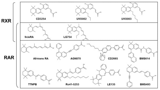 - Altucci, L.; Leibowitz, M.D.; Ogilvie, K.M.; de Lera, A.R.; Gronemeyer, H. RAR and RXR Modulation in Cancer and Metabolic Disease. Nat. Rev. Drug Disc. 2007, 6, 793–810. [Google Scholar] [CrossRef]