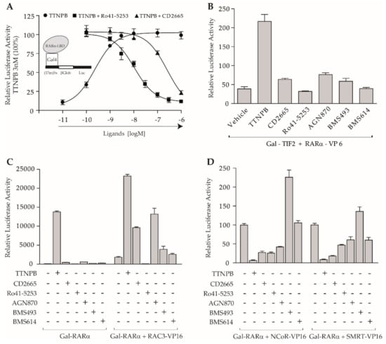 However, the Kd values reported were > 1000 nM, 400 nM, and 81 nM, for RARα, RARβ, and RARγ [], respectively, showing that CD2665 has a preference for both RARγ and RARβ but is also able to bind to RARα when used at micromolar concentration. Transient transactivation assays were conducted in order to assess the ability of CD2665 to affect TTNPB-induced RARα activity. In this assay, cells expressed a fusion protein comprising the LBD of RARα and the DBD of the yeast GAL4 transcription factor. Note that this reporter system is insensitive to endogenous receptors which cannot recognize the GAL4-binding site. In these experiments, the full RAR agonist TTNPB at 3 nM was challenged with increasing amounts of CD2665 for which the antagonistic activity was compared to that of the selective RARα antagonist Ro41-5253 [] (Figure 2A). Competition curves showed that CD2665 exhibits a clear dose–response inhibitory effect on TTNPB-induced RARα activity, but with an IC50 higher than that of Ro41-5253, in line with their respective affinity reported for RARα. These results show that, in addition to its antagonistic activity toward RARγ and β, CD2665 acts as an RARα antagonist.