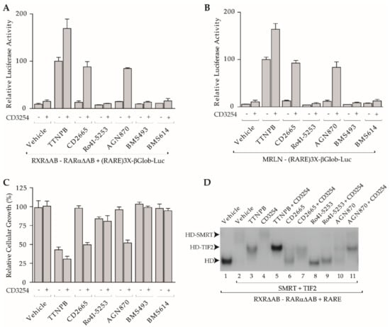 - Botling, J.; Castro, D.S.; Oberg, F.; Nilsson, K.; Perlmann, T. Retinoic acid receptor/retinoid X receptor heterodimers can be activated through both subunits providing a basis for synergistic transactivation and cellular differentiation. J. Biol. Chem. 1997, 272, 9443–9449. [Google Scholar] [CrossRef]