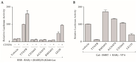 In the past, major research efforts have been directed to the identification of potent synthetic retinoids leading to the generation of a panel of modulators exhibiting or not selectivity towards RAR subtypes, and with activities ranging from agonist to inverse agonist [] [,]. Among these modulators, CD2665 has been reported as a specific RARγ/β antagonist (Figure 1).