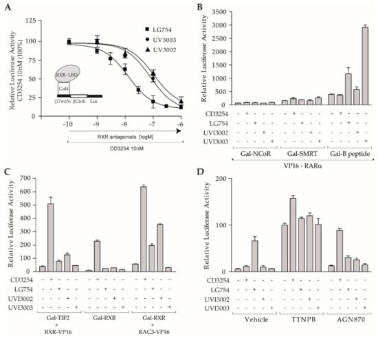 Our above results showed that an RXR agonist can participate in the activation of RXR-RAR heterodimers when combined with an RAR ligand capable of decreasing the interaction of CoR. We then evaluated the ability of other classes of rexinoids to modulate the activity of the RXR-RAR heterodimer alone or in combination with either TTNPB or AGN870 by using the MRLN cell model (Figure 5D). When used alone, CD3254 and the two UVIs did not significantly activate RXR-RARα. Importantly, and in accordance with previous reports [,], LG754 acted as an activator of the heterodimer by reaching a transactivation level of about 70% of that induced by the full RAR agonist TTNPB. Added at 1 µM to fully saturate RARα LBD and in combination with TTNPB, both UVI3002 and LG754 caused a slight over-activation compared to TTNPB alone, but less than the increase observed with CD3254, while the antagonist UVI3003 had no effect. Similar cooperativities were observed with AGN870 at a lower extent due to the antagonistic nature of this RAR compound. Together, these data show that the two heterodimer subunits retain their ligand and co-regulators binding properties, and that rexinoids can contribute to heterodimer activity in combination with an appropriate RAR ligand. Binding of a RAR ligand capable of dissociating CoRs is a prerequisite for the activation of the heterodimer.